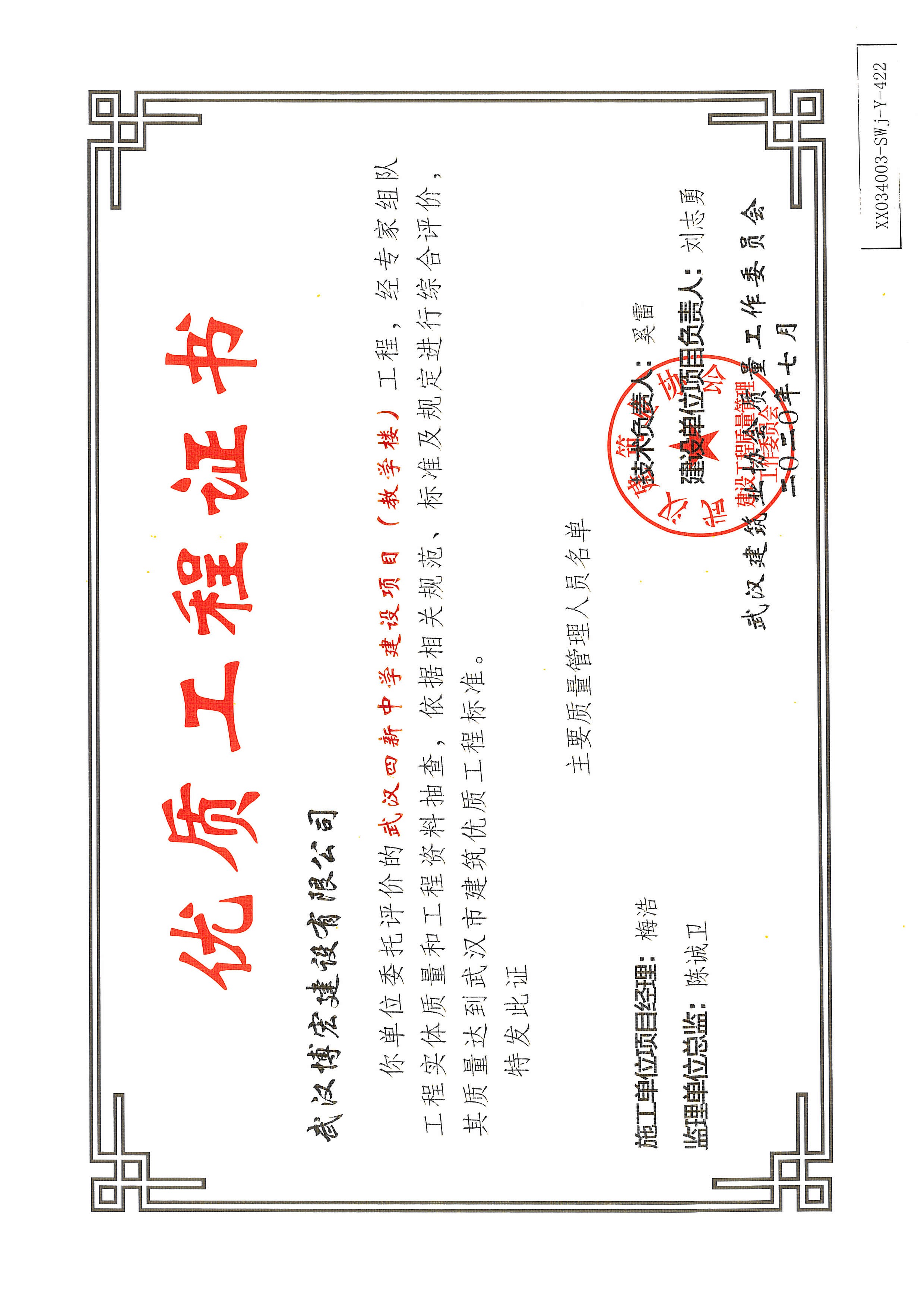 優(yōu)質(zhì)工程證書(武漢四新中學建設項目(教學樓)