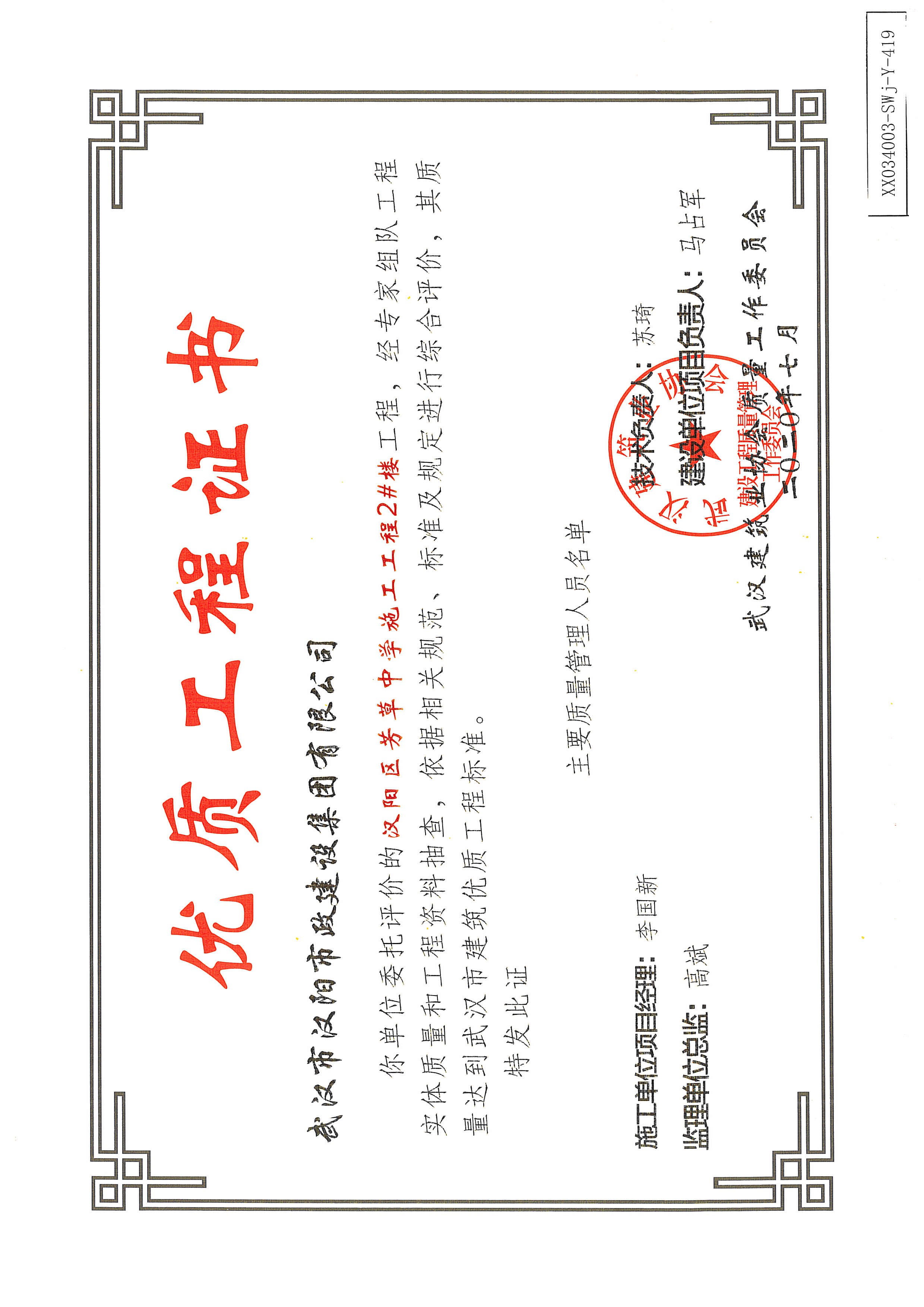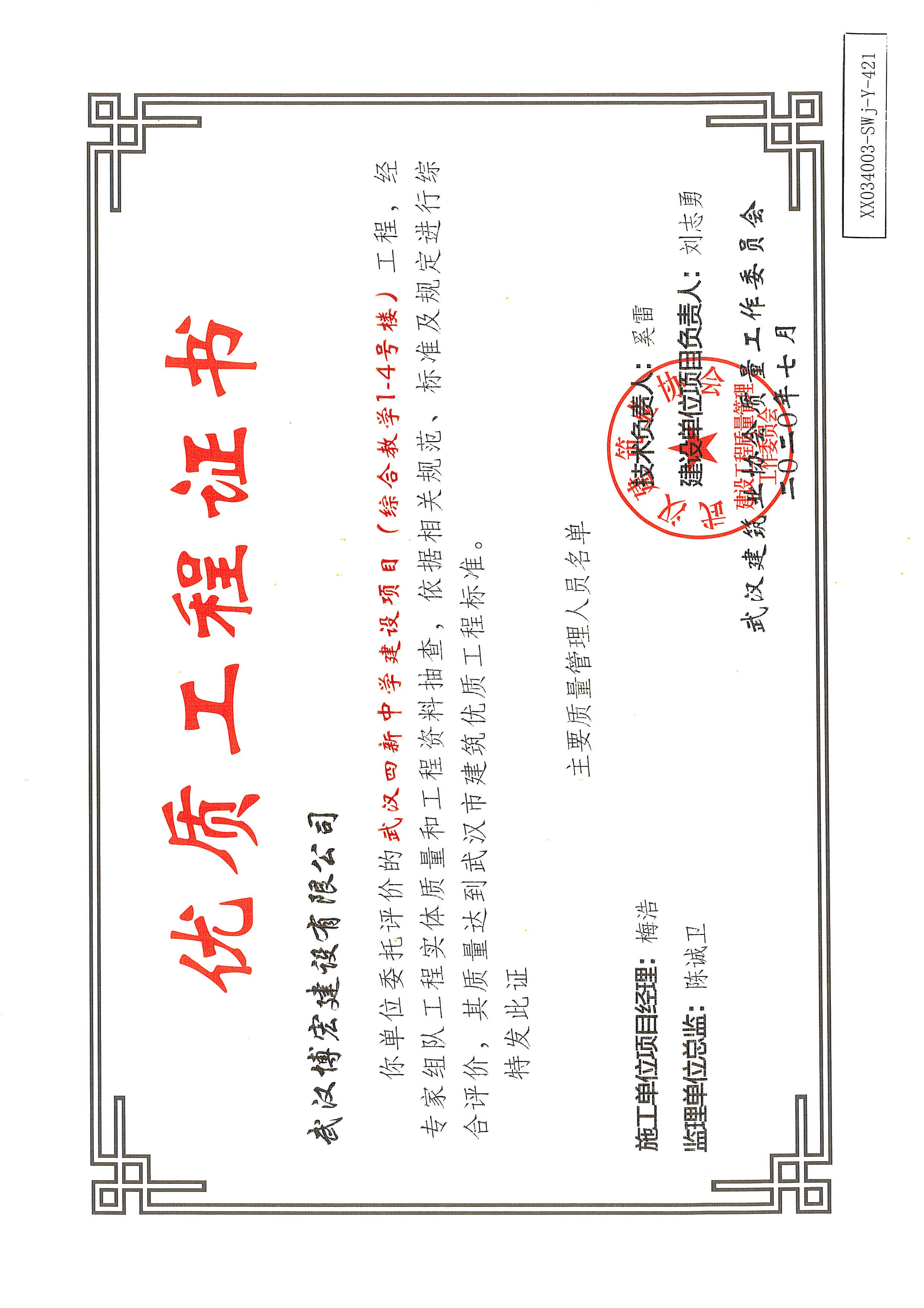 優(yōu)質(zhì)工程證書(武漢四新中學建設項目工程(綜合教學1--4號樓)