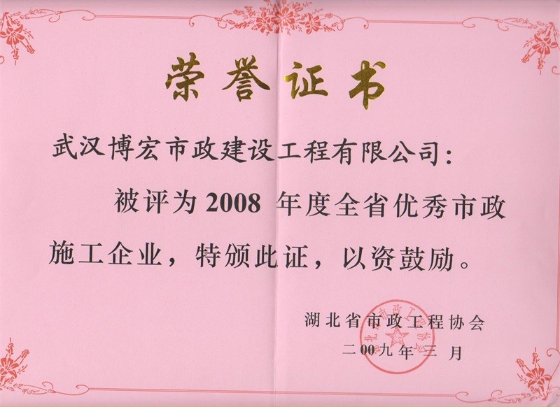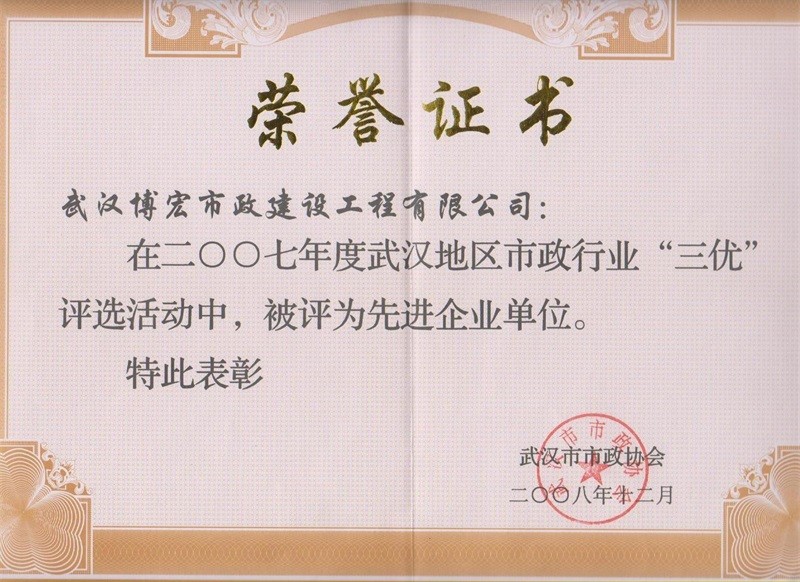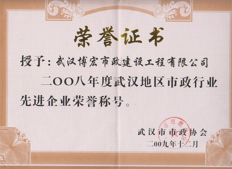 2008年度武漢地區市政行業先進企業榮譽稱號