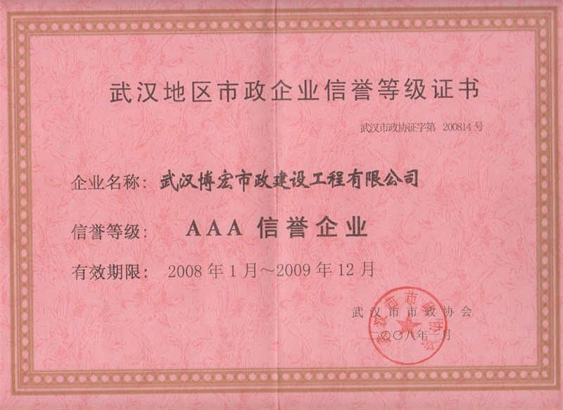 2008-2009年度武漢地區市政企業信譽等級證書(AAA信譽企業)