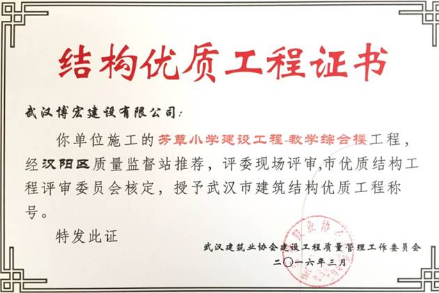 我單位施工的芳草小學(xué)建設(shè)工程(芳草路與四新北路交匯處西北角)1#教學(xué)樓、2#教學(xué)樓、教學(xué)綜合樓工程,經(jīng)漢陽(yáng)區(qū)建筑管理站推薦,評(píng)委現(xiàn)場(chǎng)評(píng)審,武漢建筑業(yè)協(xié)會(huì)建設(shè)工程質(zhì)量管理工作委員會(huì)核定,授予武漢市建筑結(jié)構(gòu)優(yōu)質(zhì)工程稱號(hào)。