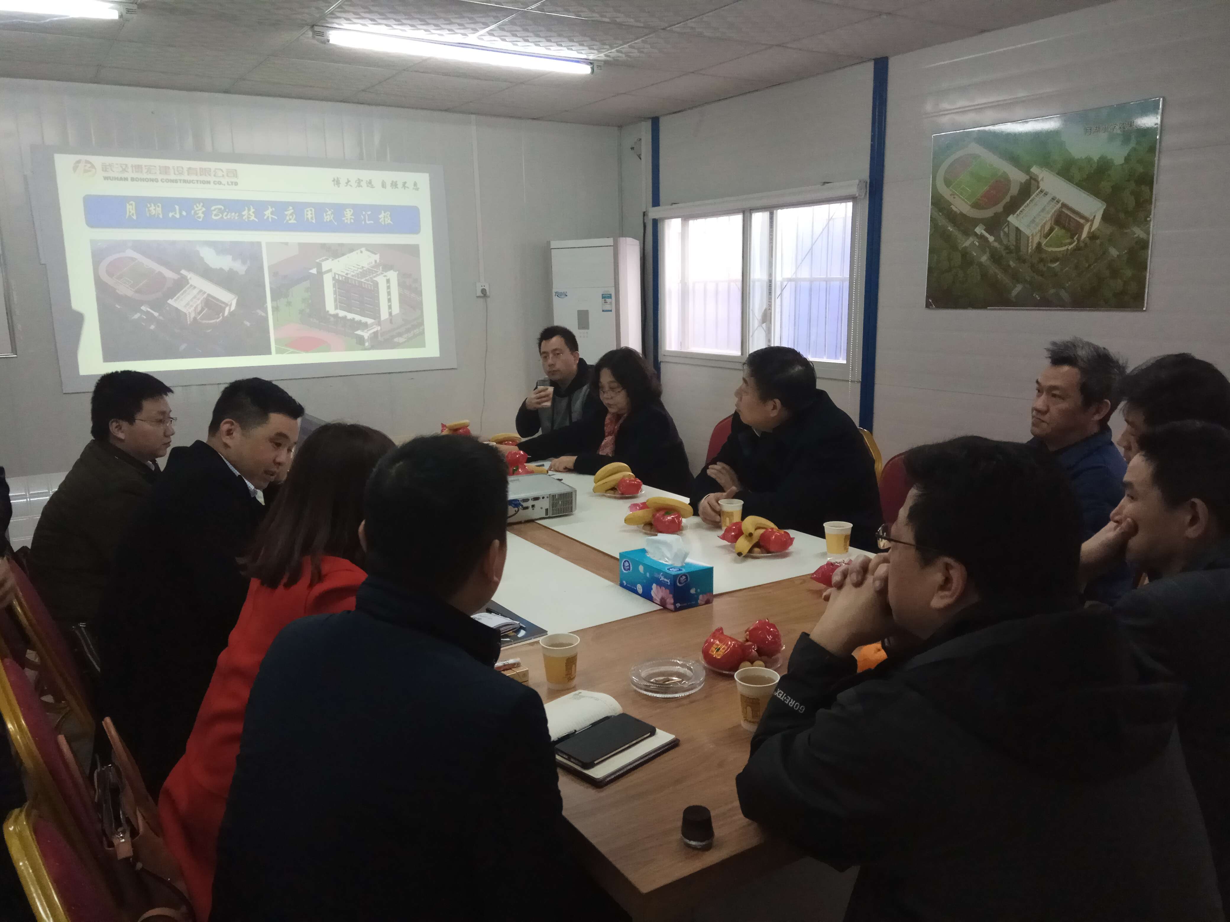 考察交流會議上為加強(qiáng)雙方了解,公司經(jīng)營副總蘇琦首先就公司近年來發(fā)展及資質(zhì)情況進(jìn)行了簡單介紹。接下來公司副總工程師梅浩對BIM技術(shù)在月湖小學(xué)施工建設(shè)中取得的效果進(jìn)行了概述。總工辦文志勇從圖紙審查、碰撞檢查、可視化交底、砌體排磚、進(jìn)度質(zhì)量安全管理、施工模擬等多個(gè)方面一一介紹BIM技術(shù)為月湖小學(xué)工程建設(shè)帶來的成果及效益,總結(jié)了BIM技術(shù)應(yīng)用經(jīng)驗(yàn),并簡單介紹了下一步BIM應(yīng)用計(jì)劃安排。