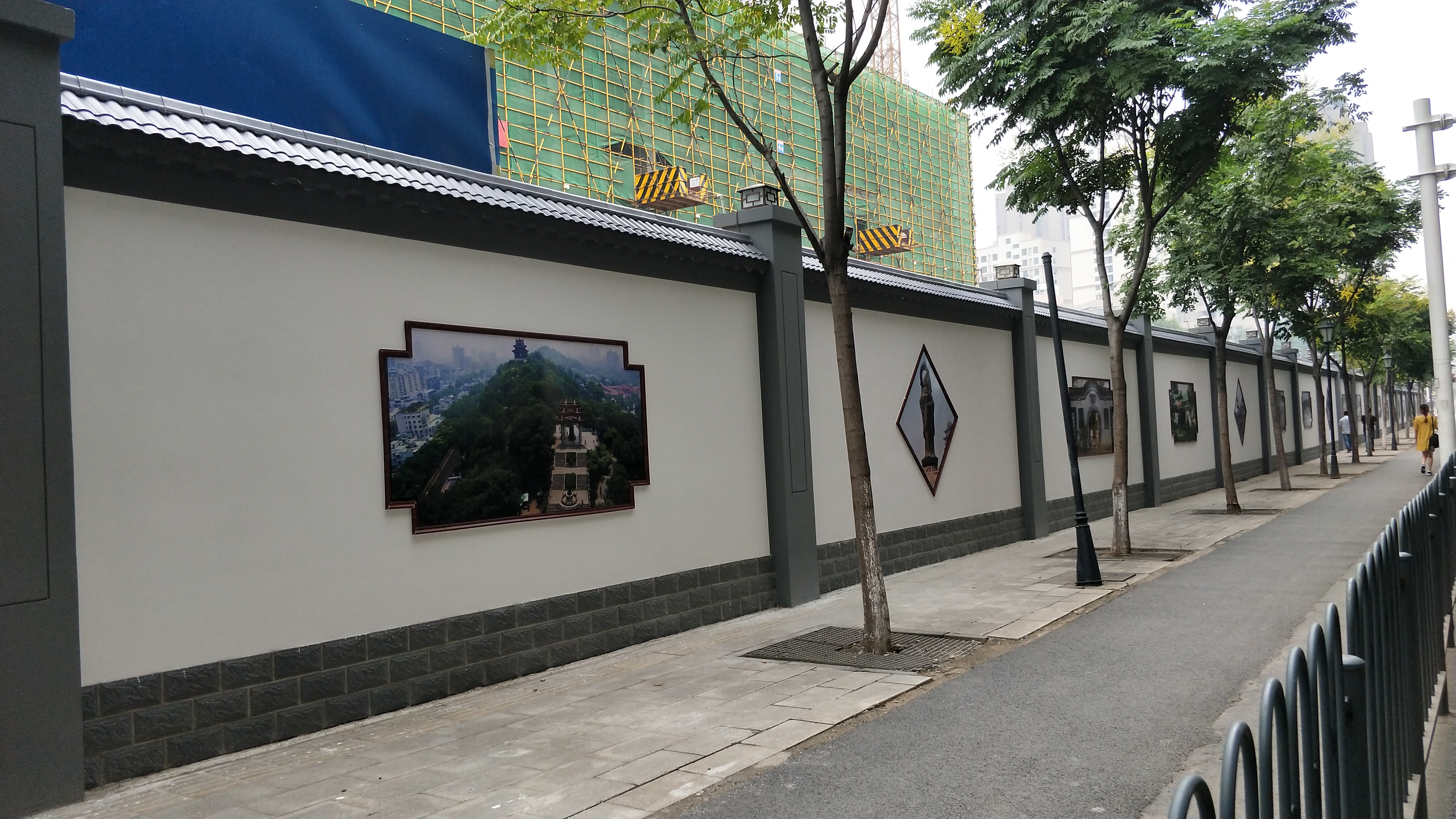 項目建設伊始便針對現場安全文明布置采取了專項措施,按照楚天杯的標準實施建設。工地圍墻方面,項目施工現場多采用磚砌體圍墻與“古典中國風”裝飾,裝飾材料均采用環保節能材料,高度高于2.5m,墻體安全牢固無破損,且進行了美化、亮化、彩色噴繪畫面及裝訂古典園林建筑畫框妝點。定期對宣傳墻、圍擋進行檢查、清洗和刷新。有歪斜破損的及時更換,保證其干凈、整潔、無亂涂、亂寫、亂張貼現象。