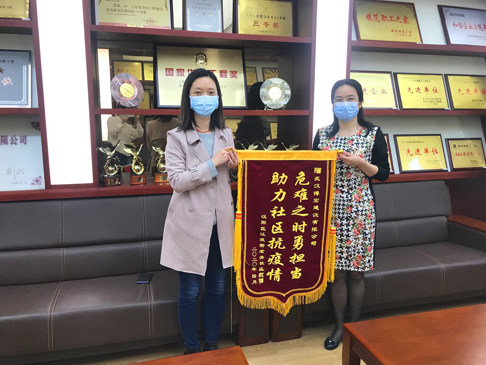 427日上午,武漢市漢陽(yáng)區(qū)江堤街老關(guān)社區(qū)書(shū)記馮霞懷著一份感恩的心,將一面印有“危難之時(shí)勇?lián)?dāng),助力社區(qū)抗疫情”的錦旗送到博宏建設(shè)支部副書(shū)記郭一清的手中,感謝博宏建設(shè)在疫情期間主動(dòng)為社區(qū)提供生活保障物資的善舉。