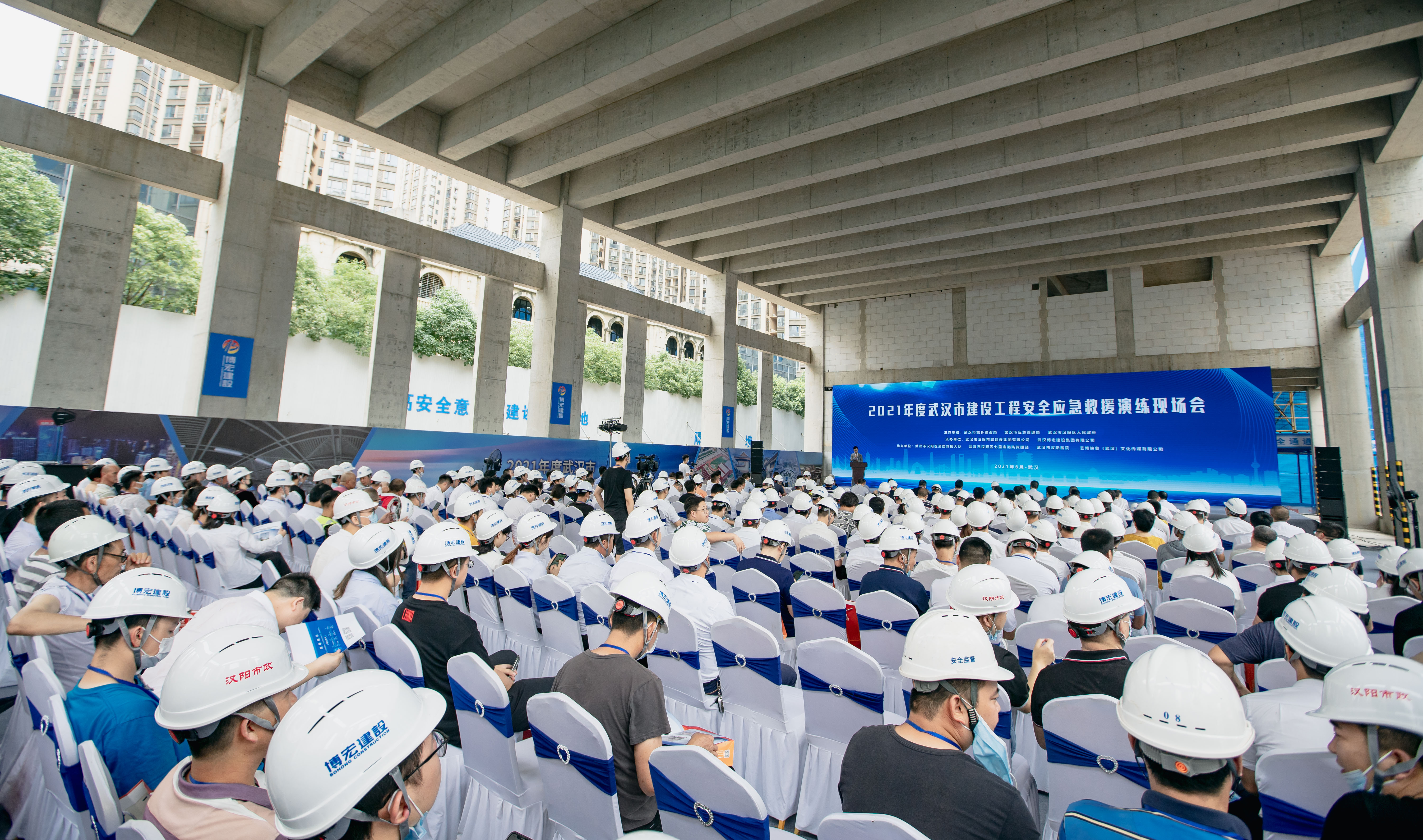 以全國第20個“安全生產月”為契機,“2021年度武漢市建設工程安全應急救援演練現場會”活動在漢陽市政博宏公司漢陽市政建設大廈項目現場順利舉行。武漢市城鄉建設局副局長榮先國、武漢市應急管理局副局長喻思源、武漢市漢陽區副區長蔡松、湖北省質安總站副站長周偉、武漢市安全站站長楊劼、武漢建筑業協會秘書長李祥林、漢陽區建設局局長胡紅勝、漢陽區應急管理局局長李漢光、各區建設局、相關建設單位及同行施工單位共計400余人參加本次活動?;顒佑蓾h陽市政集團公司、漢陽市政博宏公司共同承辦。