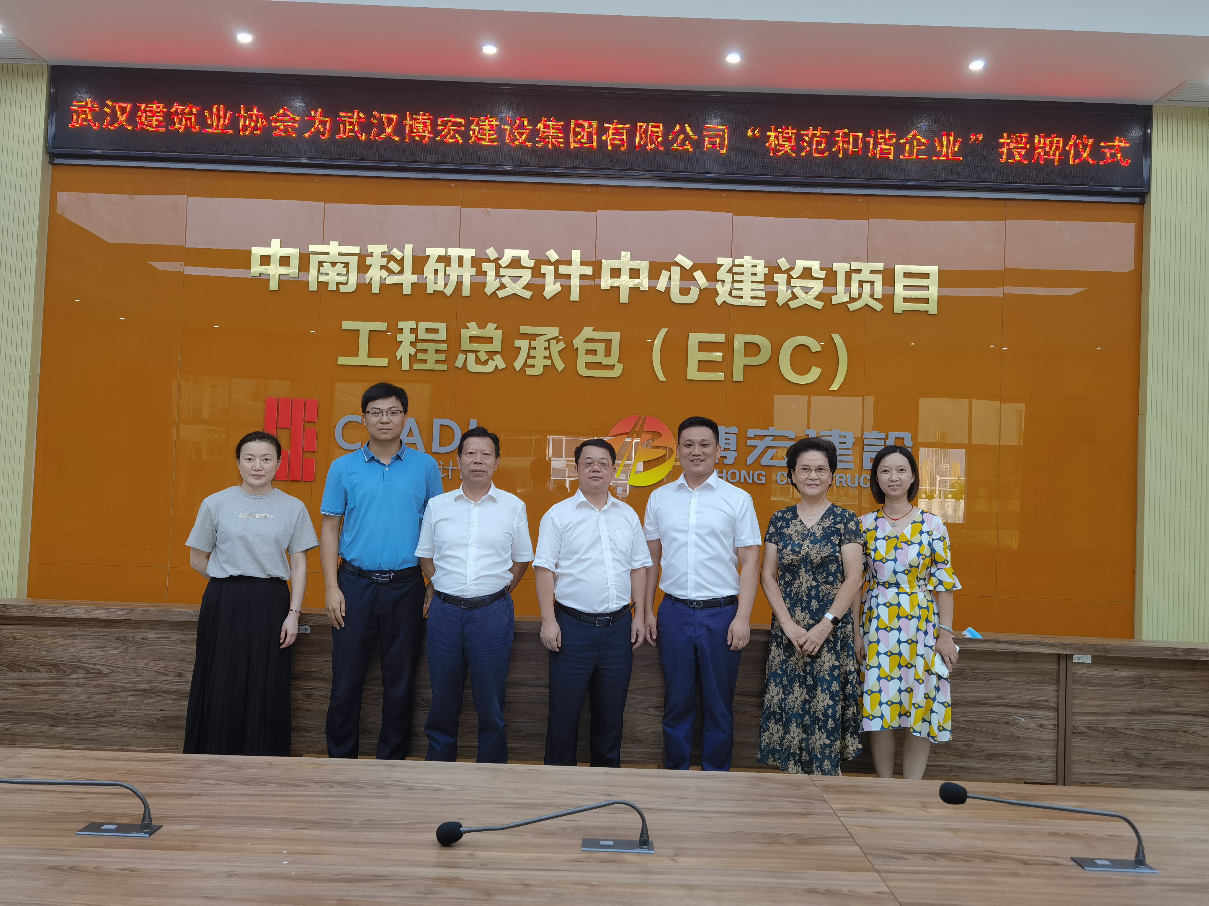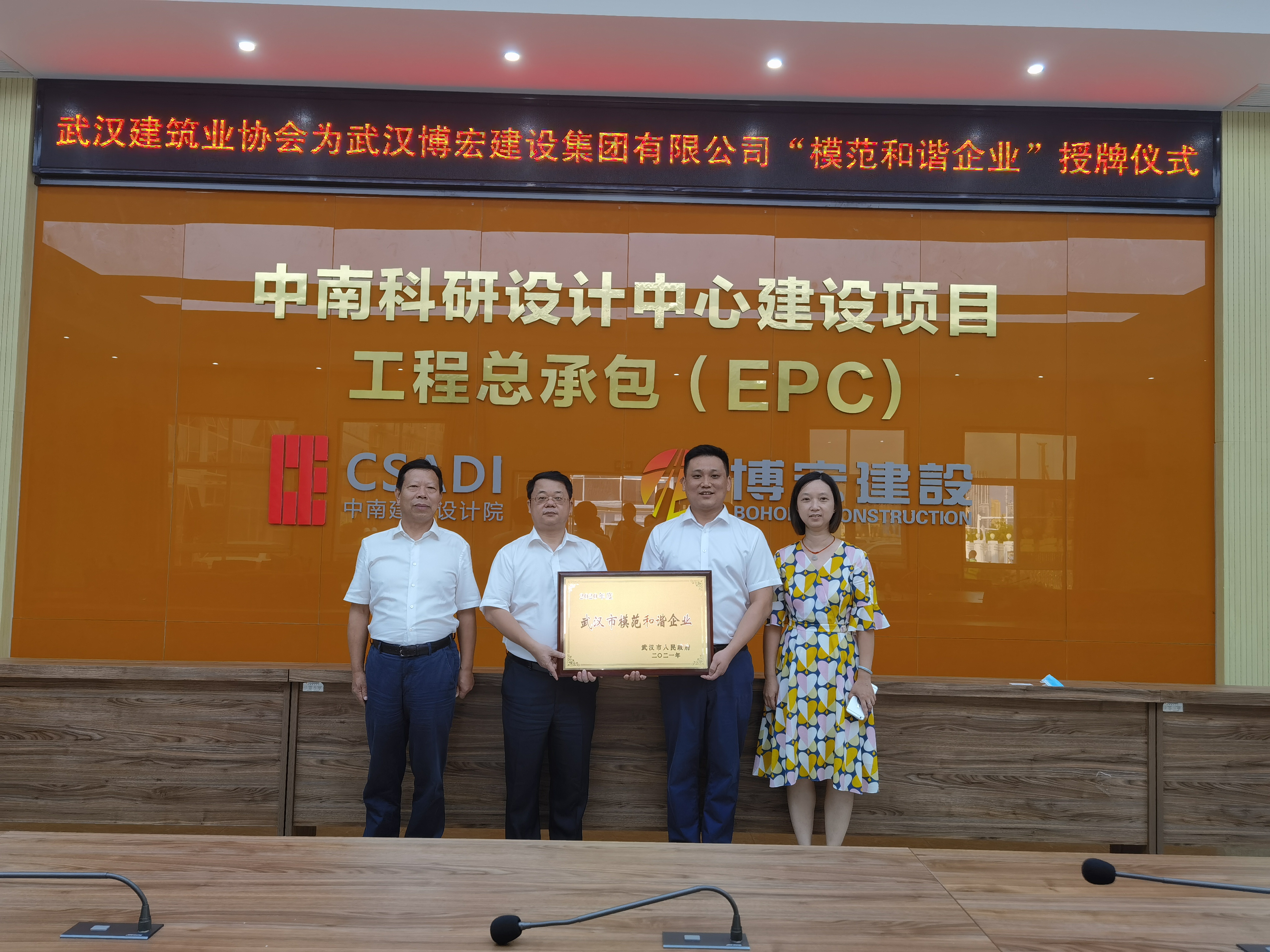 9月14日下午,博宏建設“武漢市模范和諧企業(yè)”授牌儀式在博宏建設承建的中南科研設計中心項目順利舉行。武漢建筑業(yè)協(xié)會副會長劉慶、秘書長李紅青、總工程師工作委員會副主任安維紅,博宏建設總經(jīng)理蘇琦、黨支部副書記郭一清、總經(jīng)理助理周昌文參加儀式。