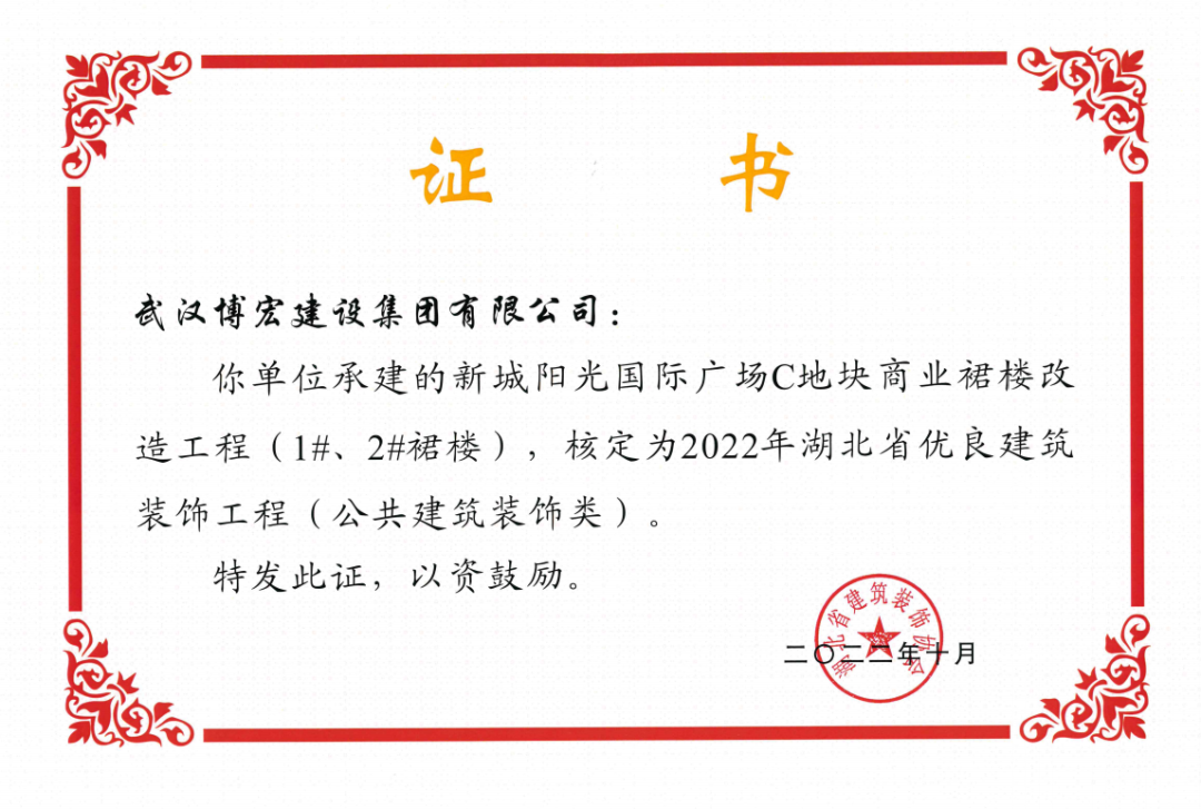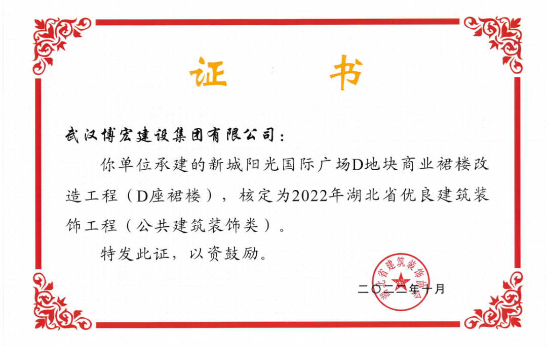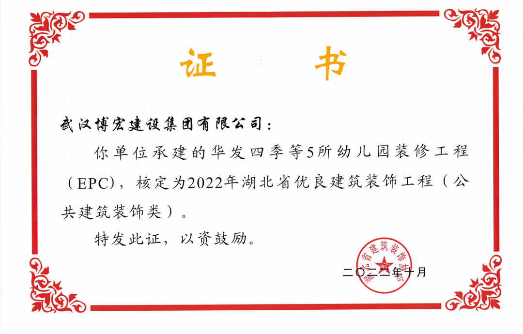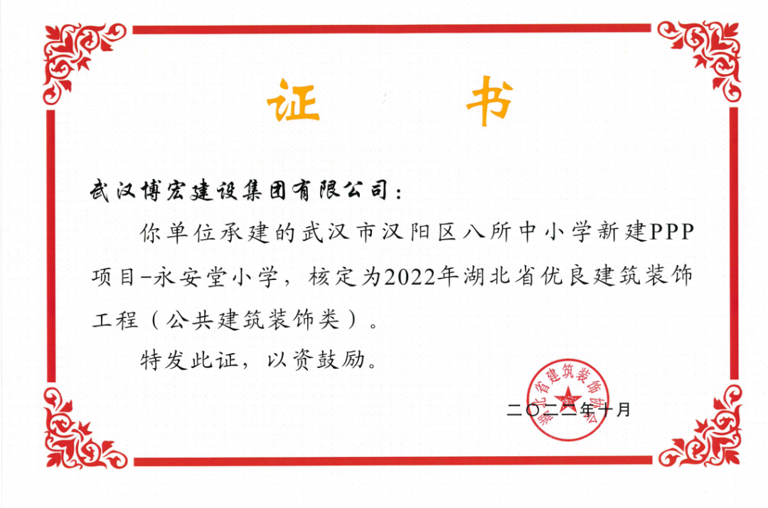 近日,湖北省建筑裝飾協(xié)會發(fā)布了《關(guān)于開展2022年湖北省建筑裝飾工程質(zhì)量目標(biāo)考核工作的通知》,由博宏建設(shè)集團(tuán)承建的華發(fā)四季等5所幼兒園裝修工程(EPC)、新城陽光國際廣場C地塊商業(yè)裙樓改造工程(1#、2#裙樓)、新城陽光國際廣場D地塊商業(yè)裙樓改造工程(D座裙樓)、武漢市漢陽區(qū)八所中小學(xué)新建PPP項(xiàng)目-永安堂小學(xué)被核定為“2022年湖北省優(yōu)良建筑裝飾工程(公共建筑裝飾類)”。