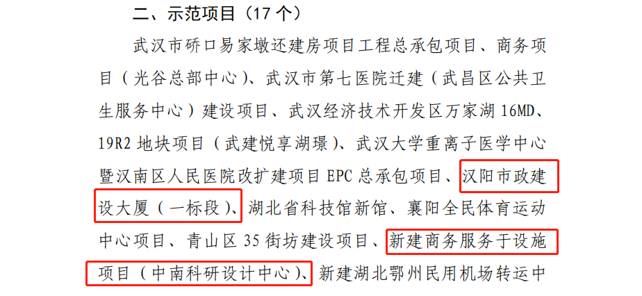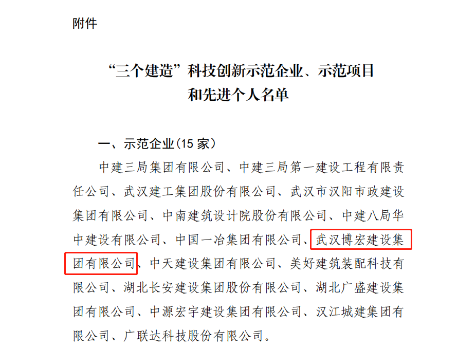 12月28日湖北省住房和城鄉建設廳發布關于綠色建造智能建造品質建造科技創新工作情況的通報,博宏建設集團入選“三個建造”科技創新示范企業;漢陽市政建設大廈(一標段)、新建商務服務與設施項目(中南科研設計中心)項目入選“三個建造”科技創新示范項目;嚴俊、楊云華入選“三個建造”科技創新先進個人。