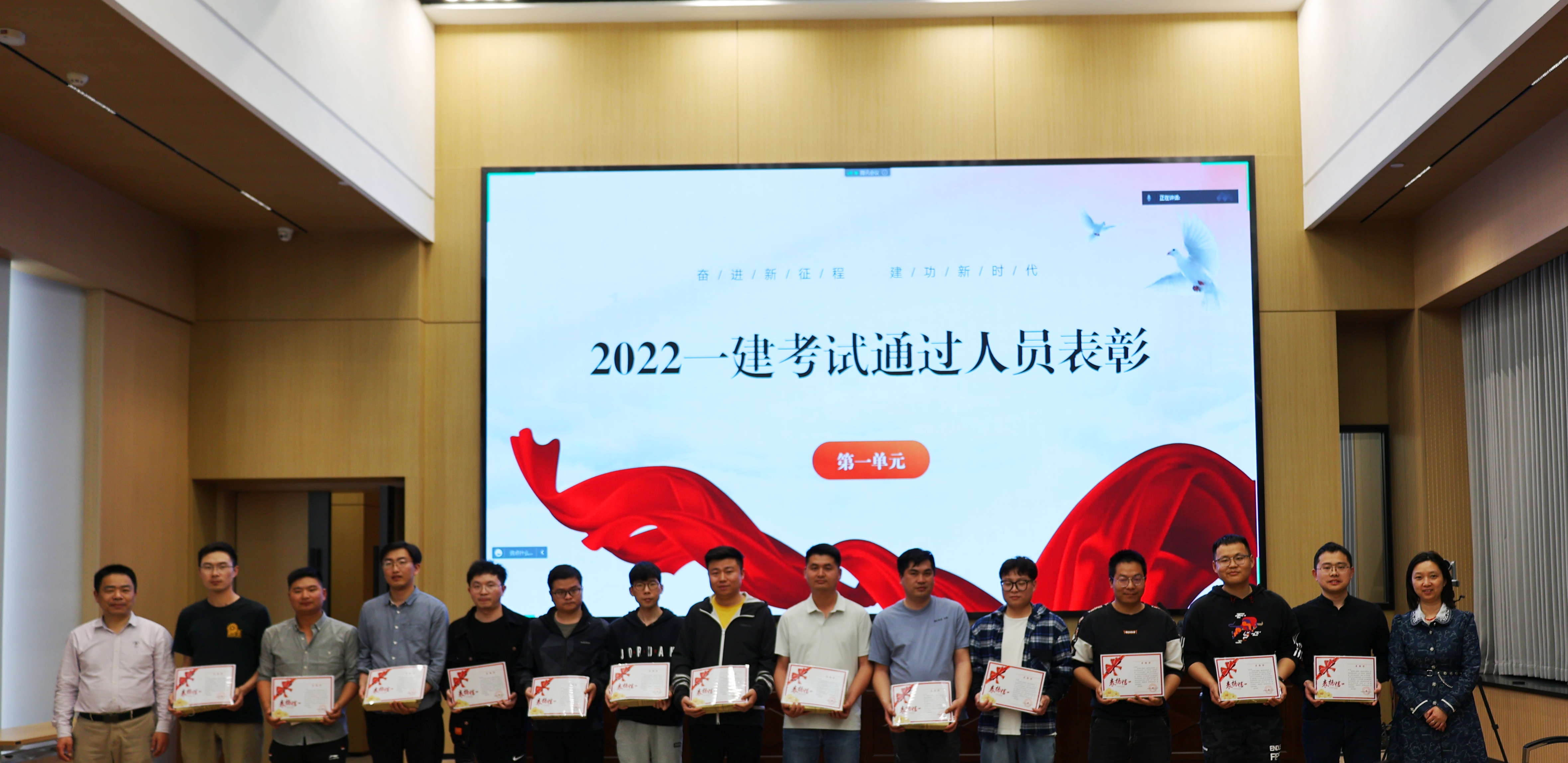黨委副書記郭一清和本次合作培訓機構講師——鑫凌眾教育資深名師甘恢義老師為2022年度16名通過一建考試的學員頒發榮譽獎品和表揚信。