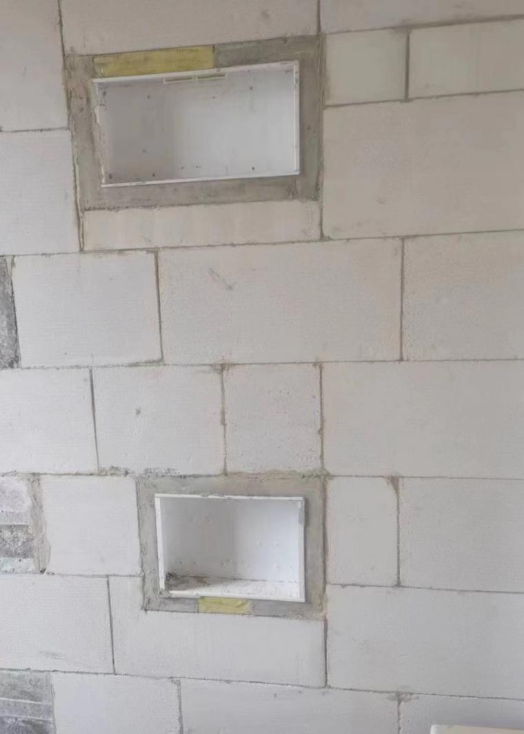 該技術在強弱電箱安裝之前先制作標準砌塊大小的模具,將電箱居中放置,安裝好進出接管,預留進線口位置,隨后倒入混凝土進行預制,成型后按照砌體排版圖紙進行砌筑即可。