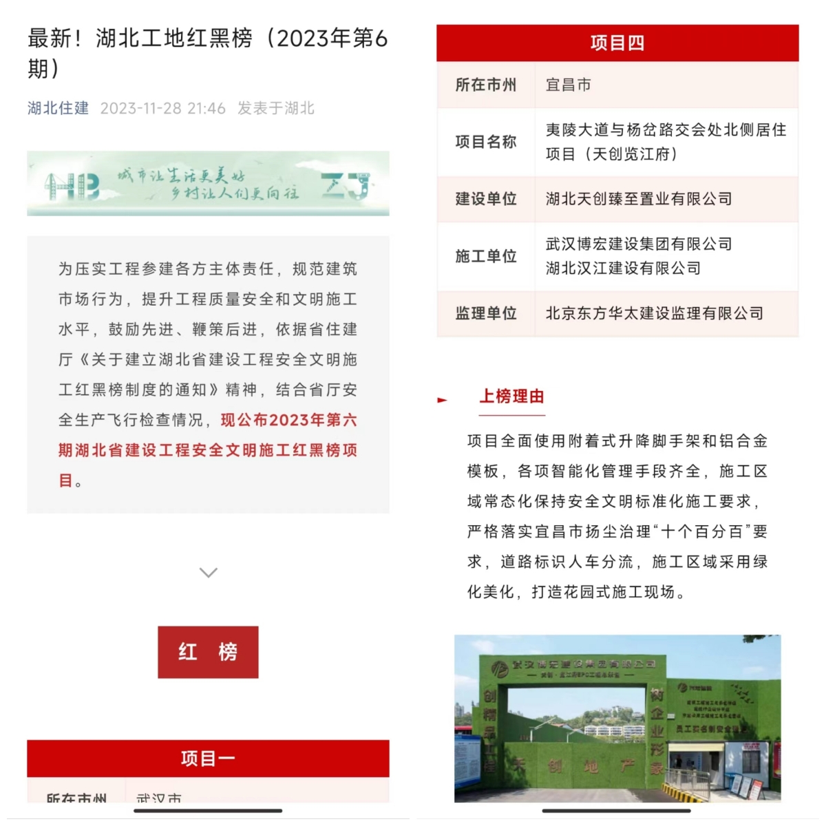 自進場施工以來,項目榮登4次宜昌市建筑市場管理紅榜,喜獲宜昌市標準化安薪工地、市安全文明工地等多項榮譽,昨日傳來喜訊:項目喜上加喜,榮登第六期湖北省建設工程安全文明施工紅榜。