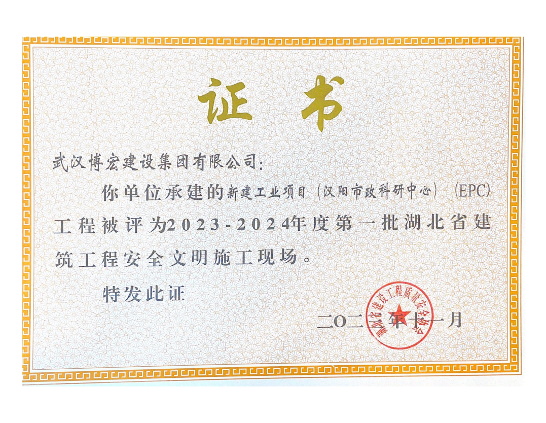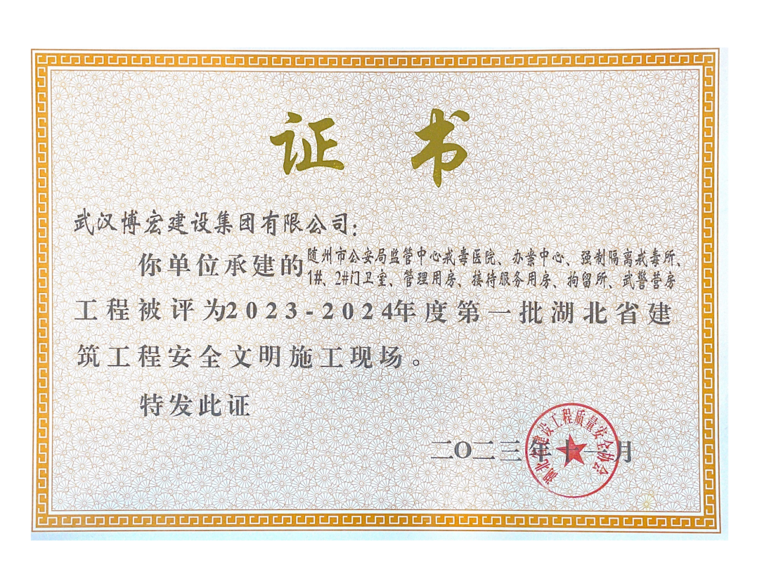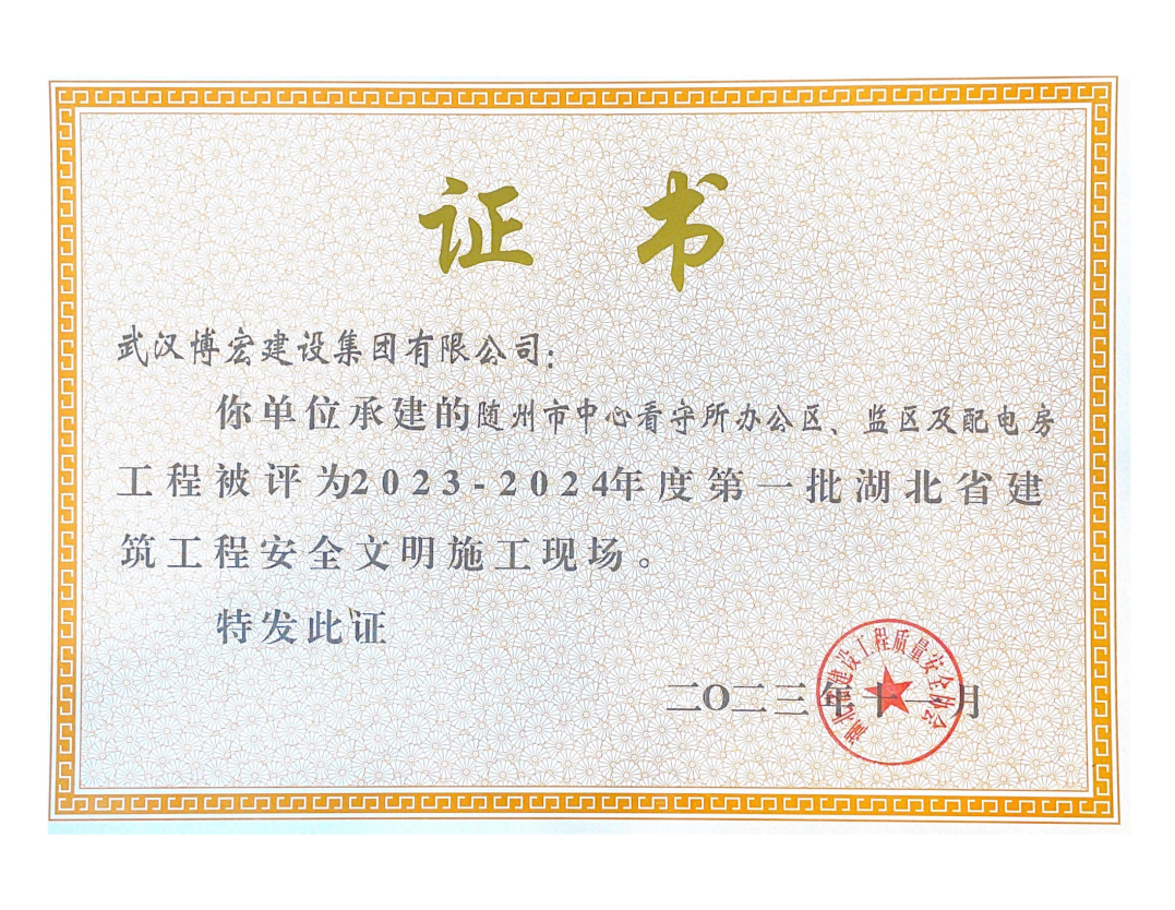 近日,湖北省建設工程質量安全協會公布了2023-2024年度第一批湖北省建筑工程安全文明施工現場名單,由博宏建設集團承建的隨州市中心看守所辦公區、監區及配電房;黃金口產業園商業設施、居住、公園綠地建設項目;新建工業項目(漢陽市政科研中心)(EPC)等8項工程獲評湖北省建筑工程安全文明施工現場。