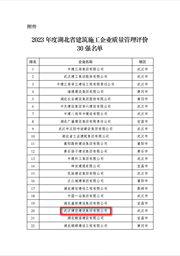 華章啟新程,開門聞喜訊。近日,湖北省建設工程質量安全協會公布2023年度湖北省建筑施工企業質量管理評價30強名單,博宏建設集團榮耀登榜!此次上榜是博宏建設集團繼2022年榜上有名后,再次憑借卓越的質量管理和施工實力登上榜單。